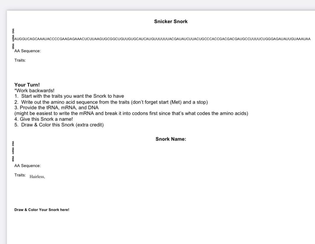 Write the mRNA the amino acid AA sequence it codes for and the related trait in the chart below. Then draw a picture of your snork based on your work.